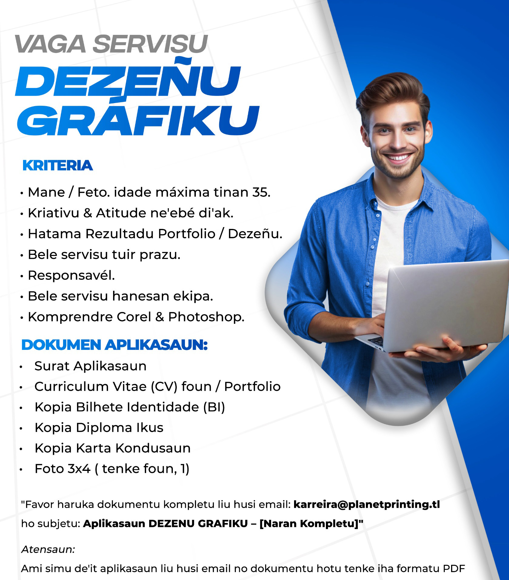 Planet Printing nakloke oppotunidade servisu ba ita bót sira ne’ebé kreativu no iha interese boot iha mundu desain. Ami buka kandidatu ne’ebé di’ak liu atu prienxe pozisaun nu’udar Dezeñu Gráfiku iha ami nia fatin, Audian, Dili.